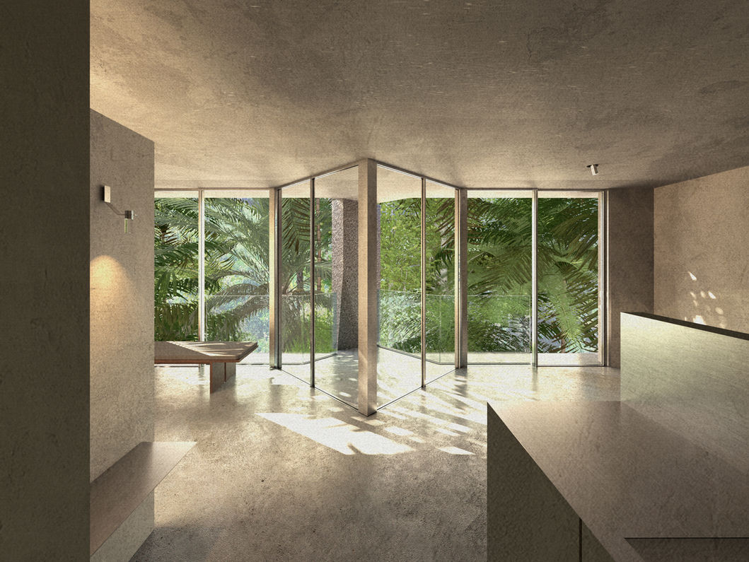 The façade draws from shapes and textures of surrounding vegetation, earth and rocks. Columns in varying shapes support a canopy of balcony slabs, providing shade and privacy, and framed views of the lush tropical garden.